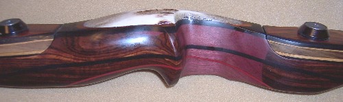 This is a stunning combination of cocabola and purpleheart. This bow is the EagleWing 11 limb configueration which is extremely smooth and accurate. Every bow I build is an individual with no two risers exactly alike. However I maintain the same geometry so that if you own one Eaglewing you know that the next one will have the same basic characteristics. Limbs are not interchangable as I hand set each set of limbs together to perfectly center the entire bow throughout. To date I have not been able to get a jig that is accurate enough for my taste. I make every effort to build a durable , precision built bow that will either perform with or outperform the very best.